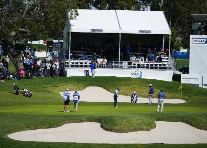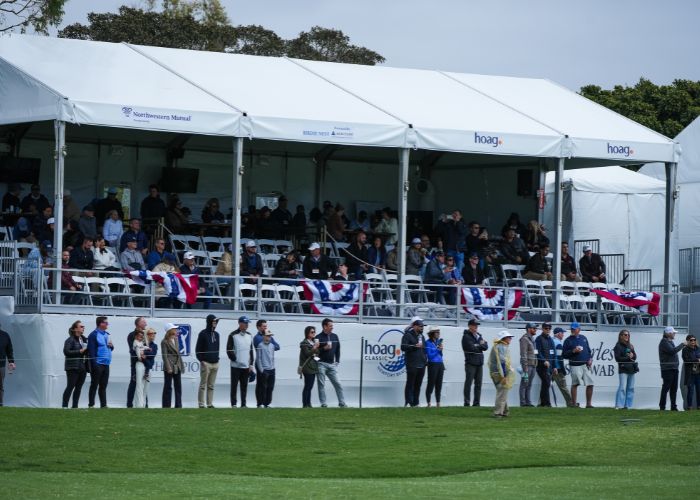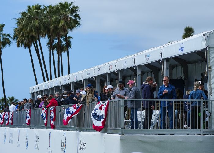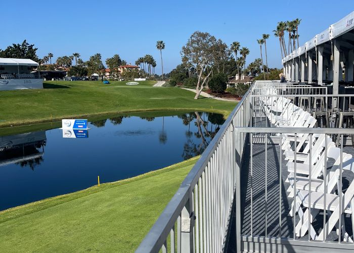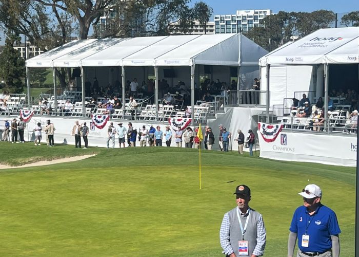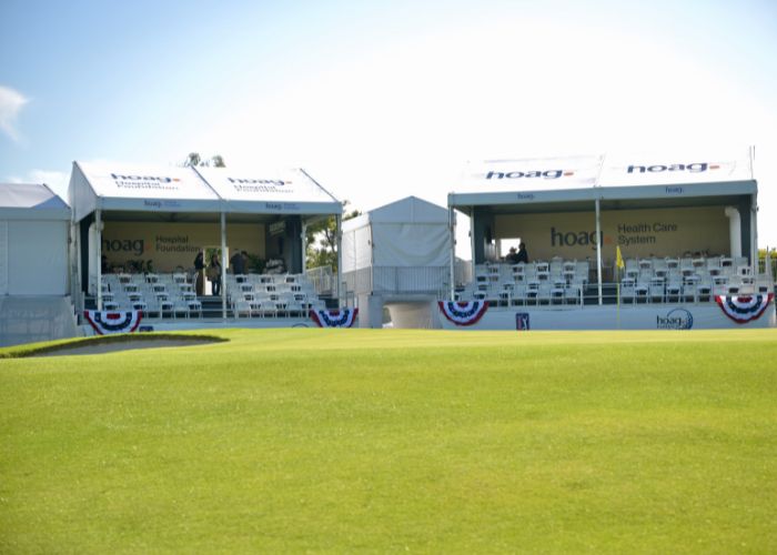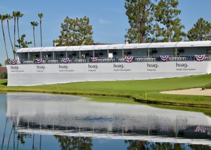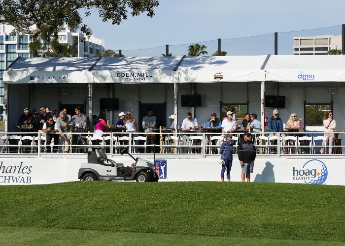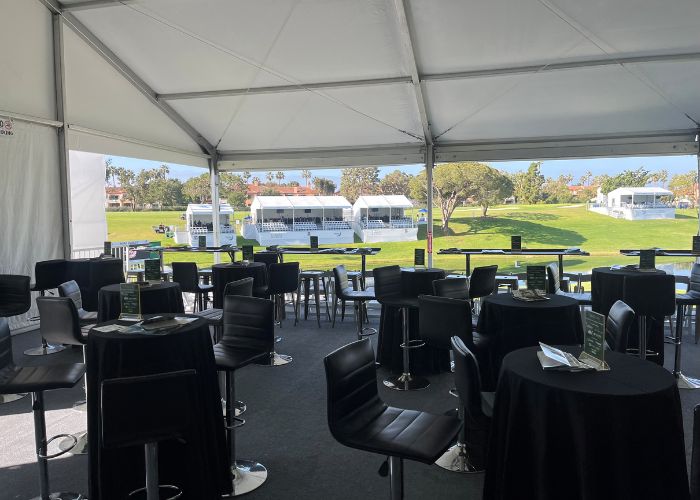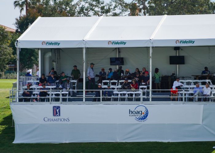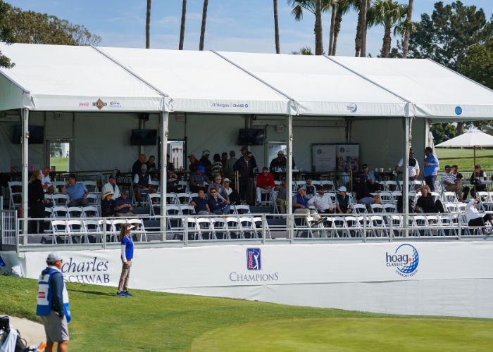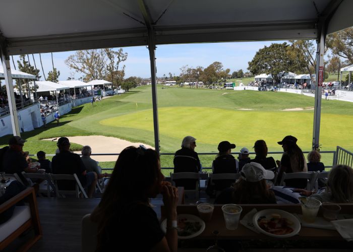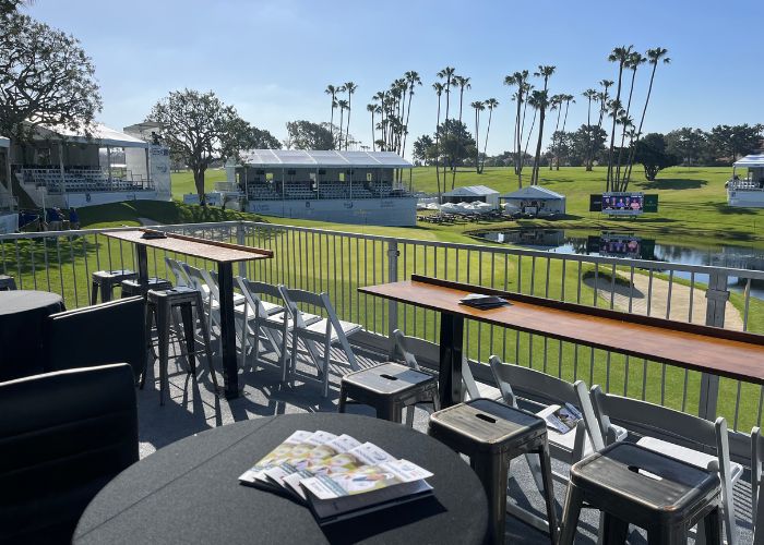 The Partners Club is a fantastic option for companies looking to experience the amenities of a Hoag Classic hospitality venue on a smaller scale. Enjoy a festive atmosphere where you can entertain guests and network with other sponsors. The skybox provides unparalleled viewing of the PGA TOUR Champions action throughout the day on the signature par-three 17th hole.