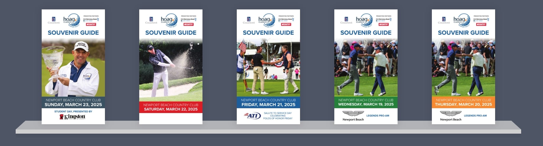 The Hoag Classic Souvenir Guide is a printed and digital guide given out during tournament week. The guide includes fan attractions, information about our charities, and each of the daily pairings for the competition. Digital versions for 2026 will be available the morning of each day.